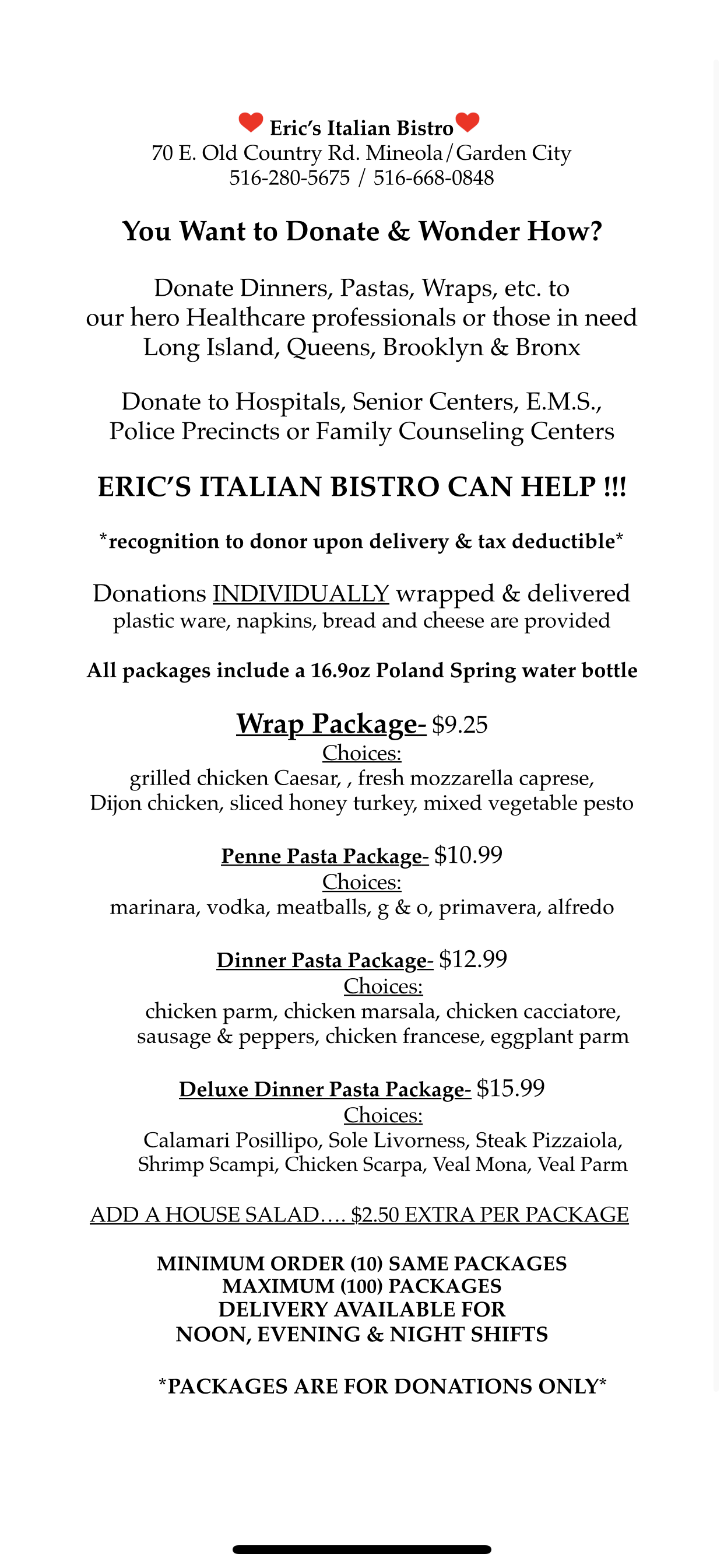 Meals Donations During Covid 19 Menu Eric S Italian Bistro Modern Italian Cuisine